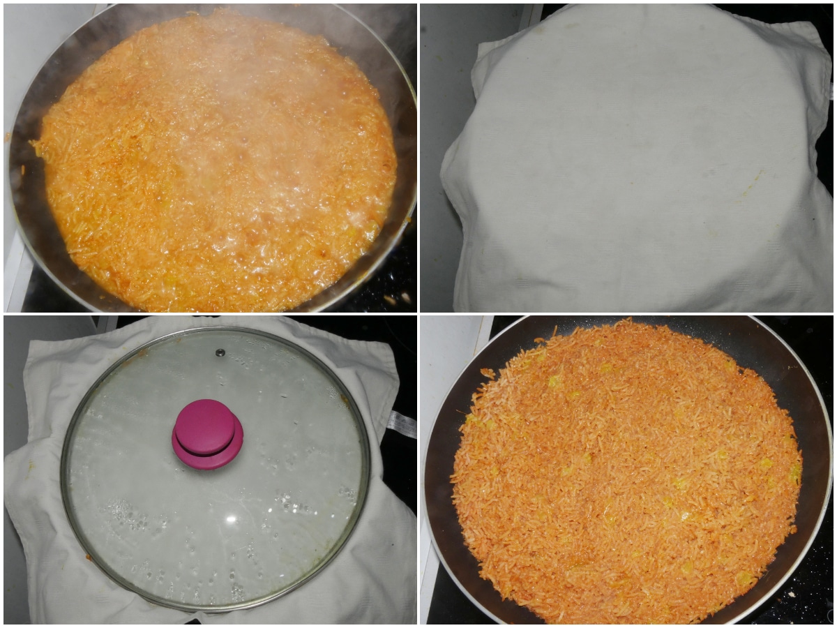 Dopo 10 minuti togliete il coperchio e controllate la cottura e che l'acqua sia stata assorbita completamente (se deve finire di cuocere e assorbire l'acqua, cuocete per qualche altro minuto), quindi togliete dal fuoco, coprite con un canovaccio pulito, chiudete nuovamente con un coperchio e lasciate riposare per altri 10 minuti.