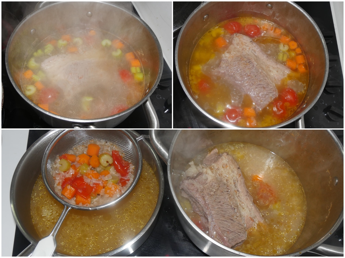Quando il brodo sarà arrivato ad ebollizione, aggiungete la cipolla e lasciate cuocere per almeno 30-40 minuti, quindi aggiustate di sale e filtrate il brodo per togliere carne e verdure.
