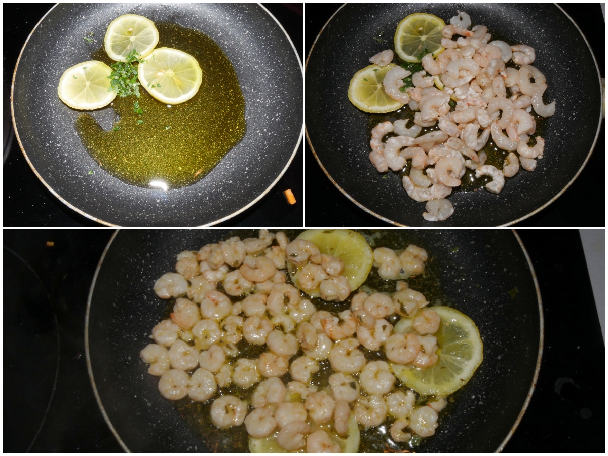 Nel frattempo pulite i gamberi se non l'avete ancora fatto (qui la guida per farlo al meglio), poi fate scaldare in una padella dell'olio con fettine di limone e foglioline di menta, poi unite i gamberetti e fateli cuocere per pochi minuti a fiamma vivace.