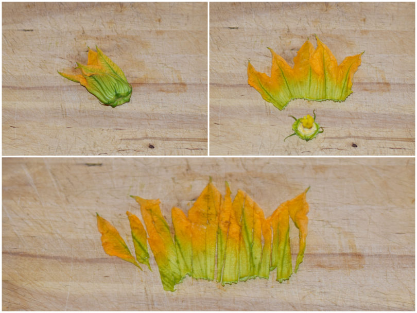 Mondate i fiori di zucca eliminando gambi, base e pistillo, quindi apriteli e tagliateli a striscette.