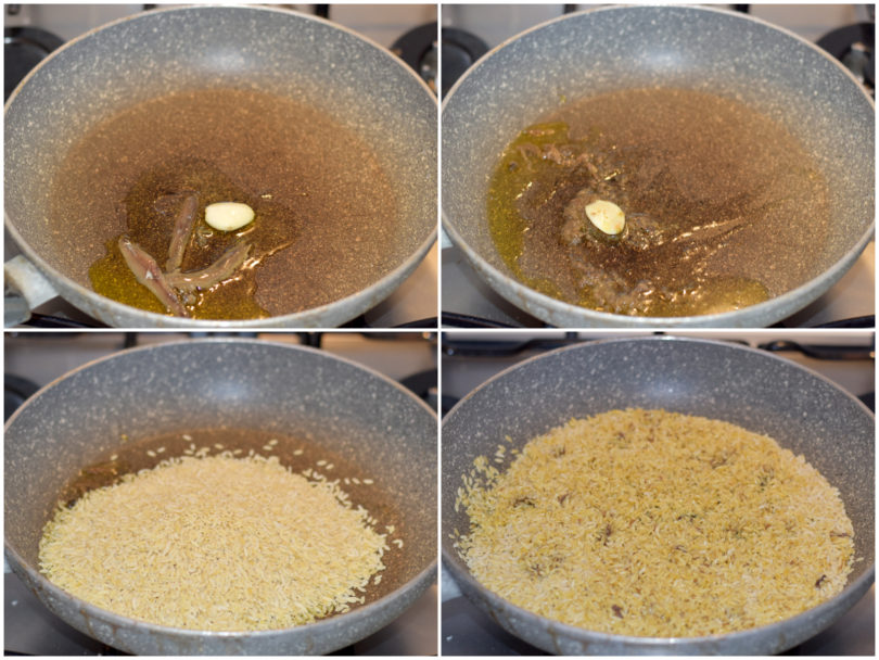 Preparate un soffritto con aglio, olio e alici salate: mescolate bene e, quando le alici si saranno sciolte, eliminate l'aglio, unite i risoni e fateli tostare.