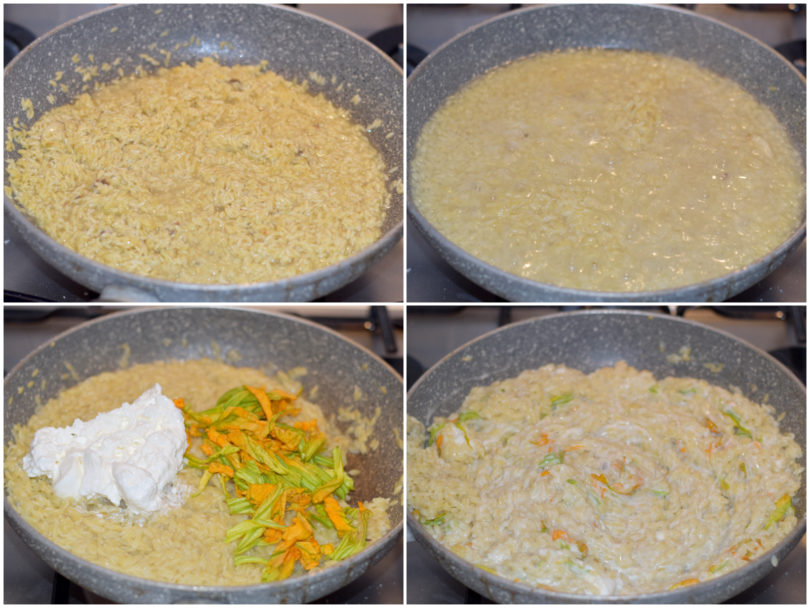 A fine cottura spegnete il fuoco, mantecate unendo stracciatella e fiori di zucca e aggiustate di sale.