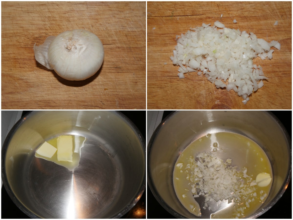 Mondate e tritate la cipolla, quindi fatela appassire con il burro in una casseruola.