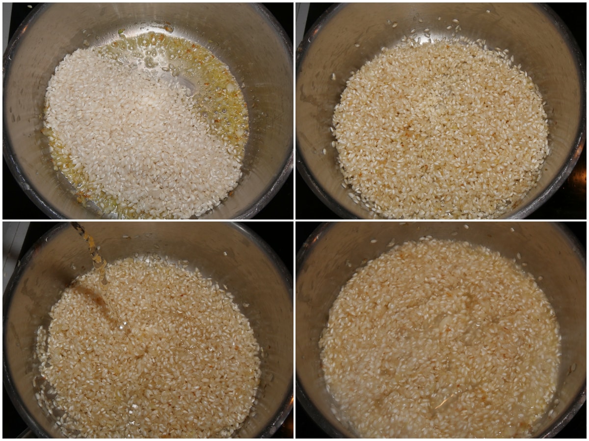 Unite il riso, lasciatelo tostare nel condimento, mescolando, quindi sfumate con il vino.