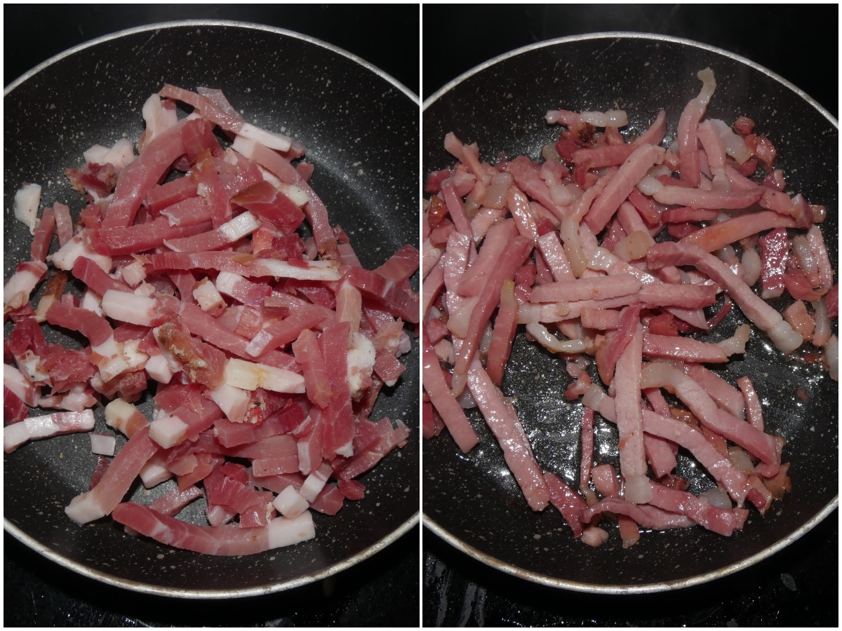 Nel frattempo fate rosolare lo speck in una padella antiaderente fino a renderlo croccantino.