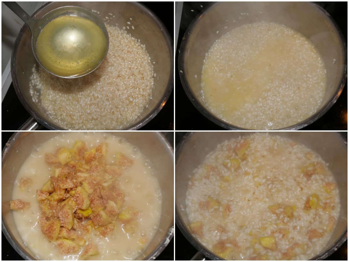 Intanto iniziate la cottura del riso, aggiungendo il brodo 1 mestolo per volta, a metà cottura aggiungete i fichi.