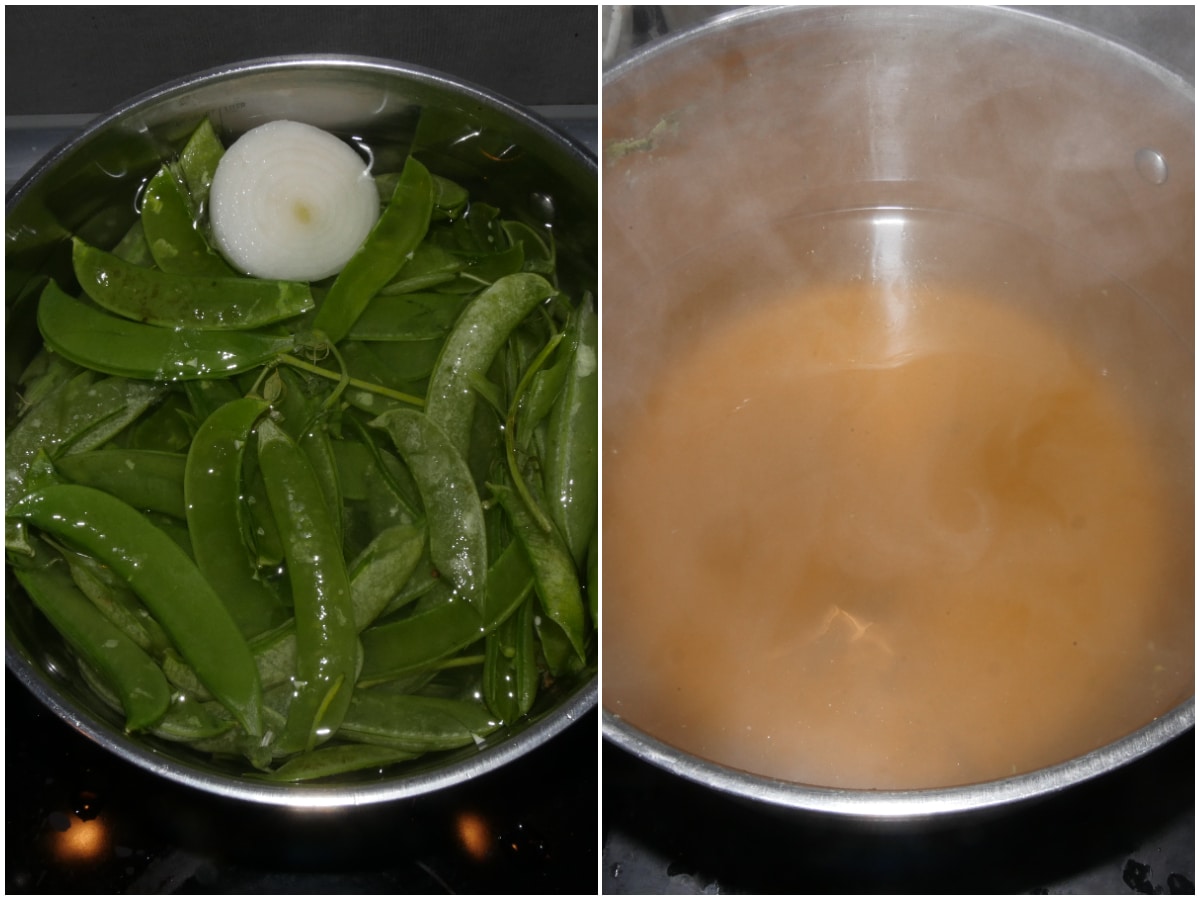 Preparate un brodo con i baccelli e metà cipolla, lasciandoli bollire per almeno 30 minuti con l'acqua.