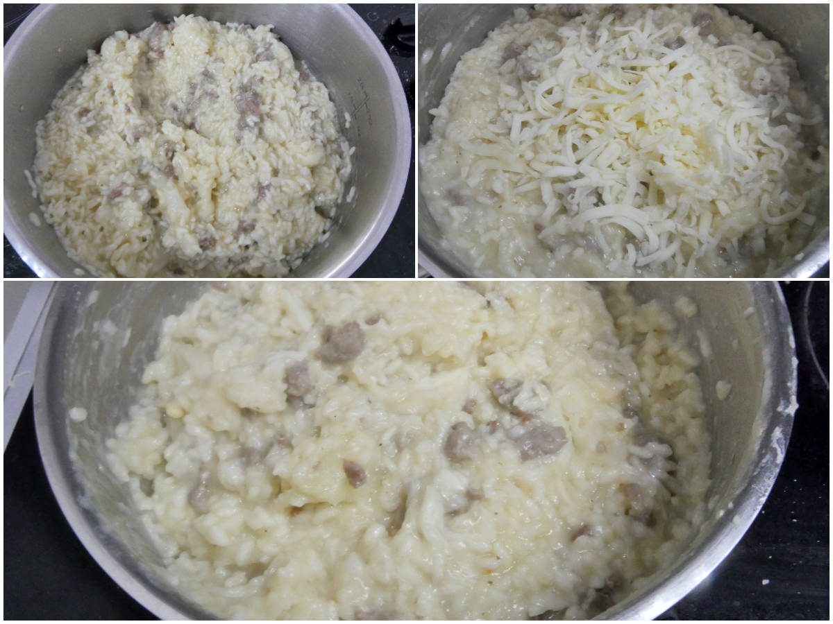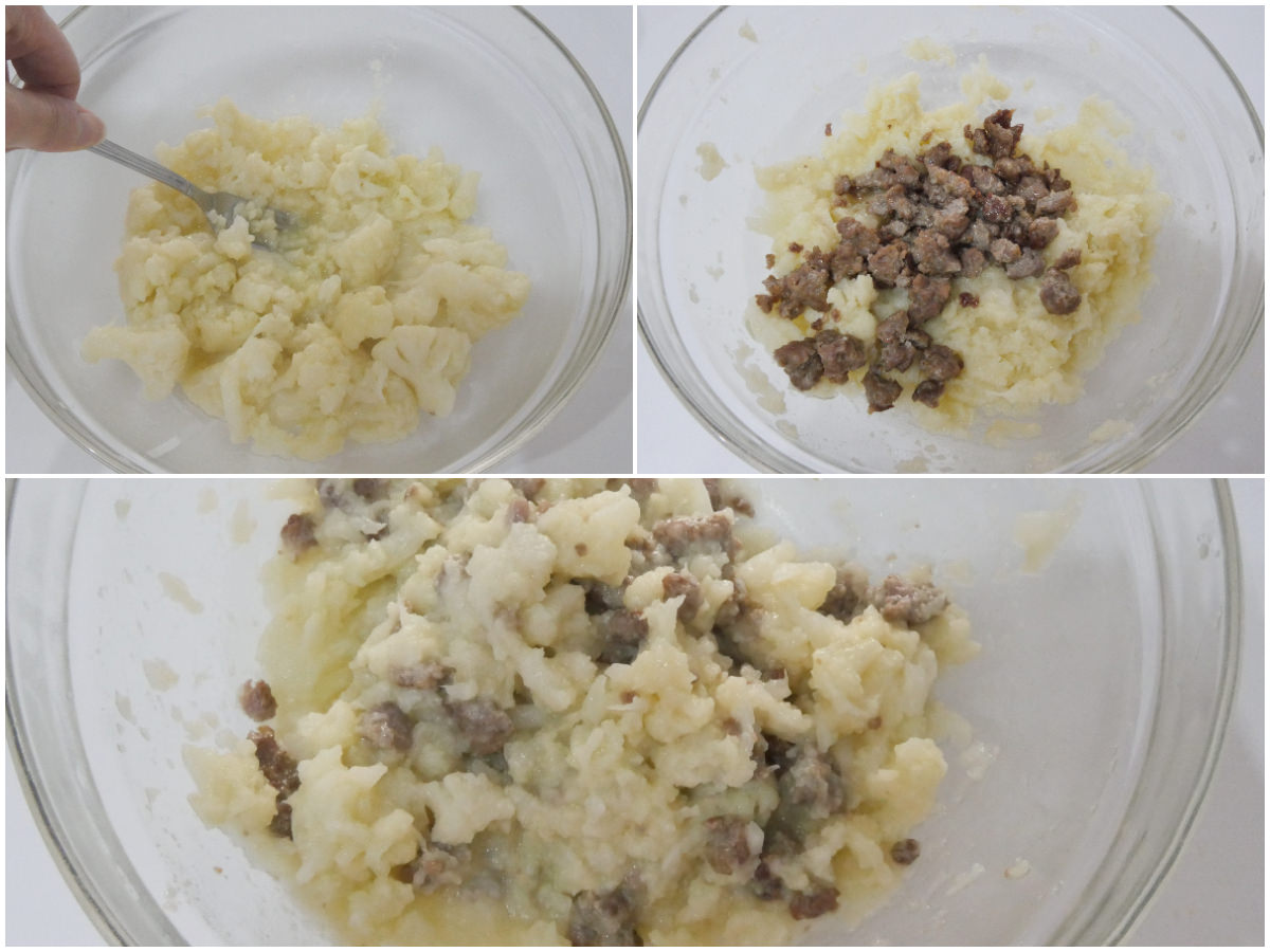 Schiacciate il cavolfiore con una forchetta, quindi aggiungete la salsiccia.