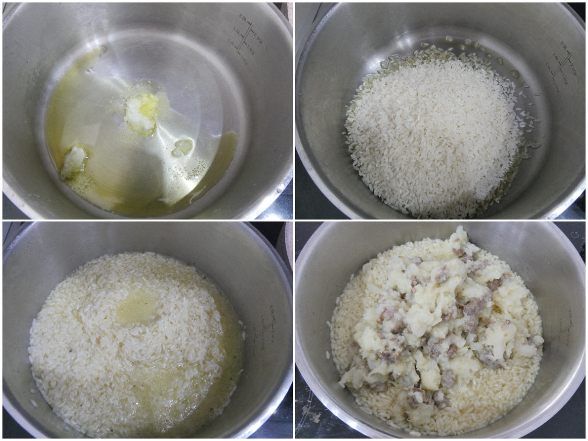 Tritate la cipolla e fatela appassire in una casseruola con un po' di olio, aggiungete il riso e fatelo tostare, quindi unite il brodo per iniziare la cottura, dopo qualche minuto unite anche il misto di cavolfiore e salsiccia.