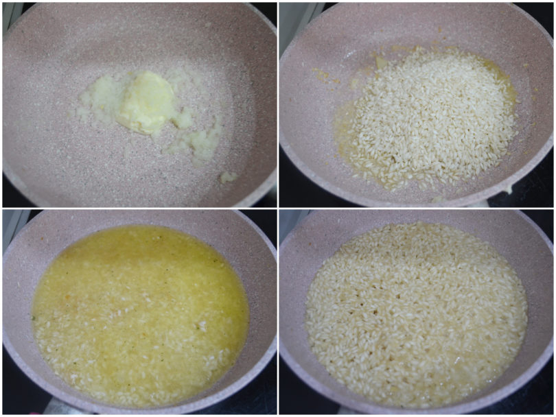 Sfumate con il marsala, quindi coprite con il brodo e iniziate la cottura, aggiungendo altro brodo man mano che viene assorbito.