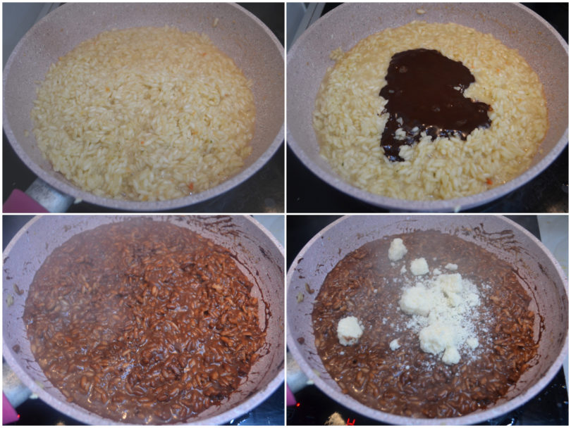 Poco prima della fine della cottura, aggiungete al riso il cioccolato fuso e mantecate con burro e parmigiano.