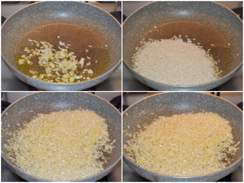 Innanzitutto preparate il risotto: fate appassire la cipolla con olio in una casseruola antiaderente, poi unite il riso e tostatelo nel condimento.