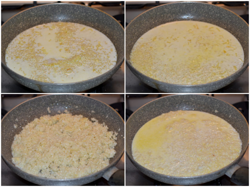 Quando il riso sarà diventato un po' trasparente iniziate ad aggiungere il latte caldo, 1/4 per volta.