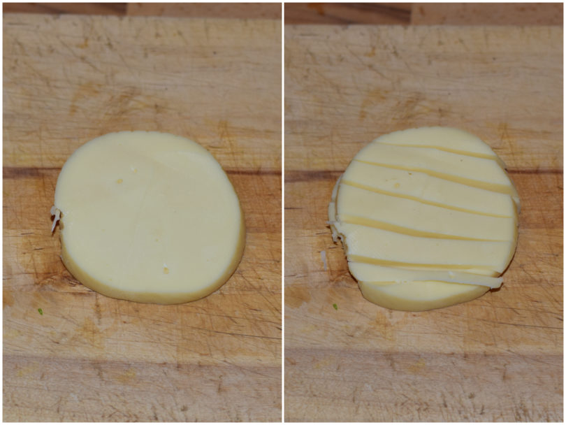 Intanto tagliate la scamorza a tocchetti e sciogliete lo zafferano nell'ultimo quarto di latte.