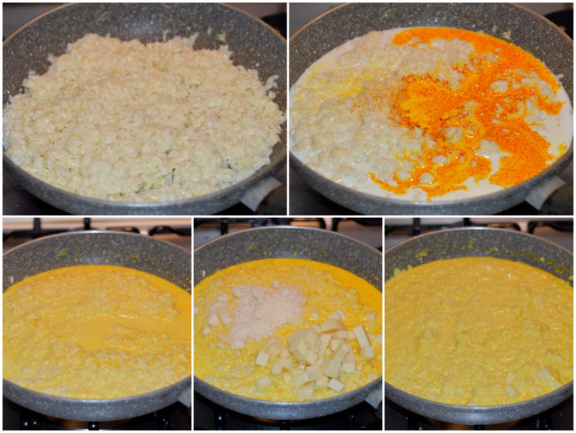 Quando il riso sarà molto al dente aggiungete lo zafferano e mescolate, poi spegnete il fuoco e unite metà scamorza e grana e aggiustate di sale.