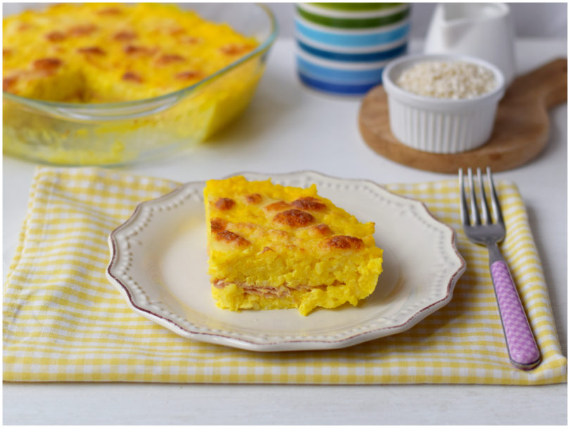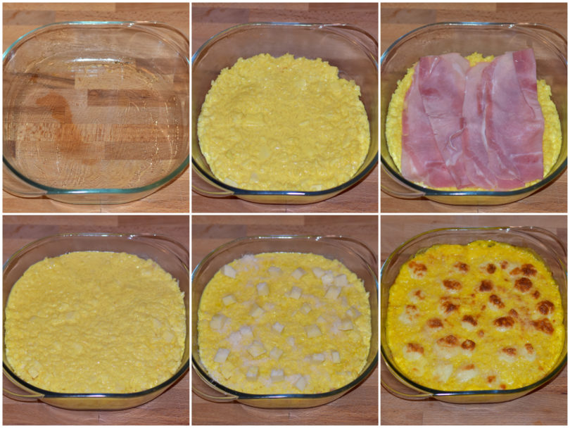 Trasferite metà del riso in una pirofila adatta al forno, livellate, coprite con il prosciutto e poi con il resto del riso.