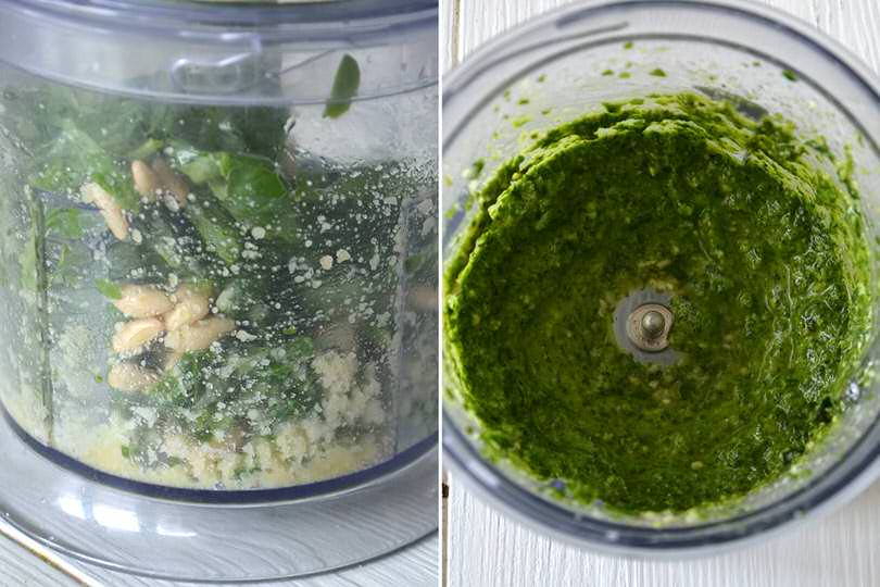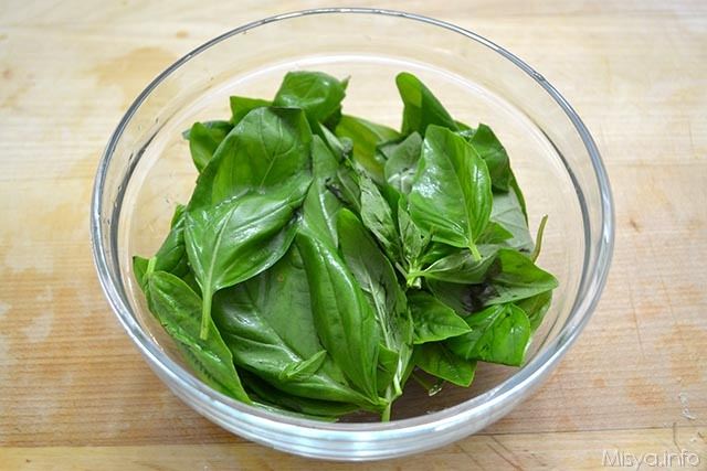 Innanzitutto preparate il pesto: lavate le foglioline di basilico e non le asciugate.