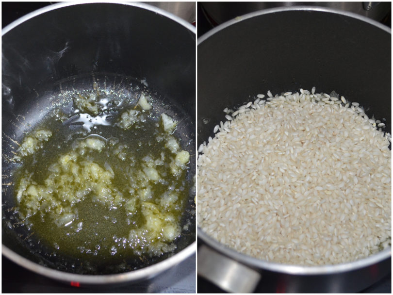 Mettete in un tegame pochissimo olio extravergine, e cipolla e fatevi tostare il riso a fiamma vivace.