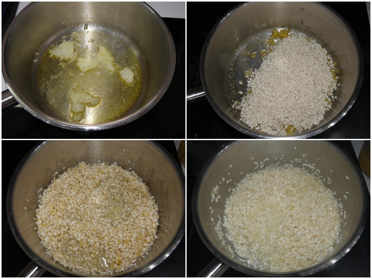 Tritate finemente la cipolla e fatela appassire in una casseruola con un po' di olio; aggiungete il riso e fatelo tostare nel condimento, quindi iniziate ad unire anche il brodo caldo, 1 mestolo per volta, aggiungendone ancora solo una volta che il mestolo precedente sarà evaporato.