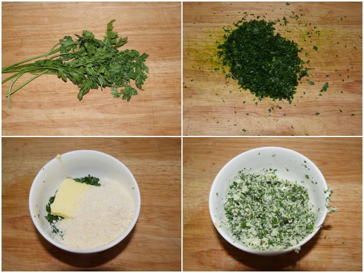 Lavate il prezzemolo, asciugatelo e tritatelo finemente, quindi mettetene un pochino da parte per decorare i piatti e lavorate il resto con formaggio e burro, in modo da ottenere un composto sbricioloso ma omogeneo.