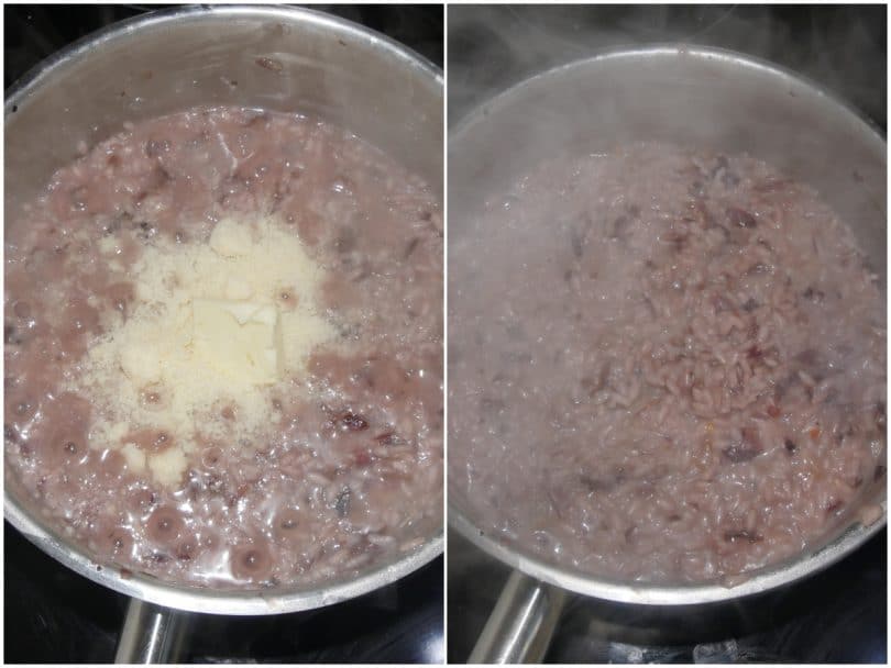 A cottura ultimata, spegnere la fiamma, aggiungere il burro e il parmigiano e mantecate il risotto al radicchio.