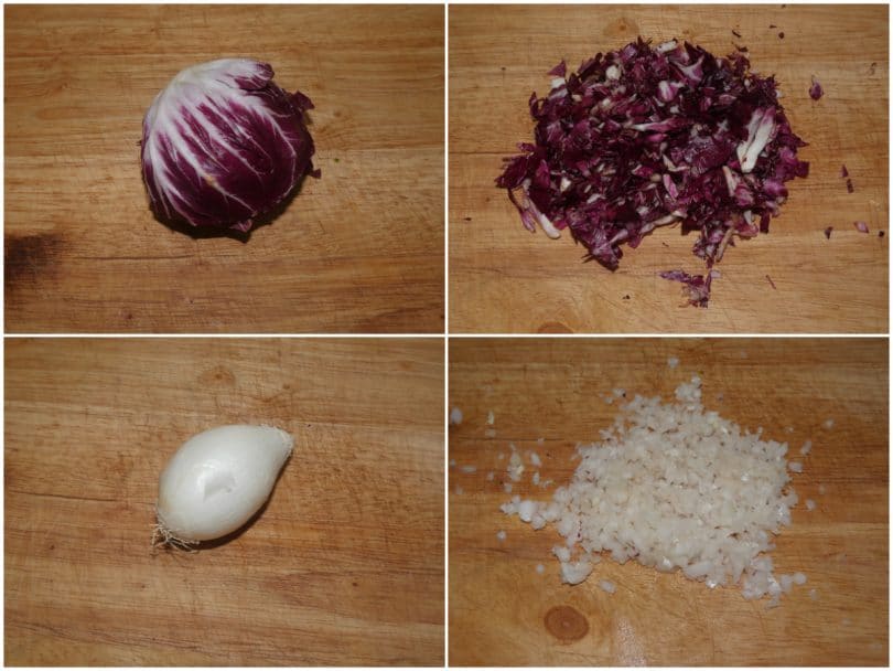 Lavate il radicchio e tagliatelo a striscioline. Affettate finemente lo scalogno.