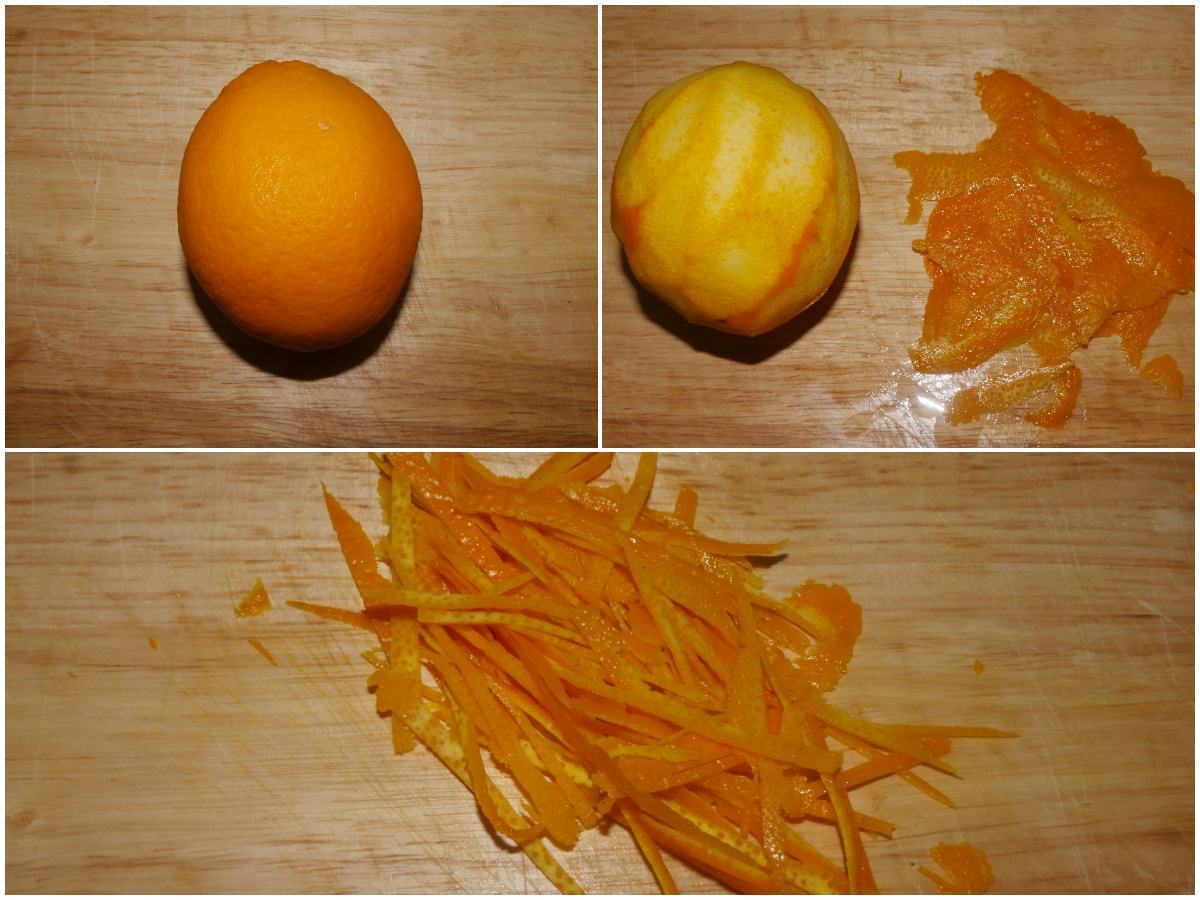 Innanzitutto lavate bene le arance, tirate via la buccia con un pelapatate (in modo da non prendere la parte bianca, più amara) e tagliatela a listarelle sottili, quindi spremetene il succo.