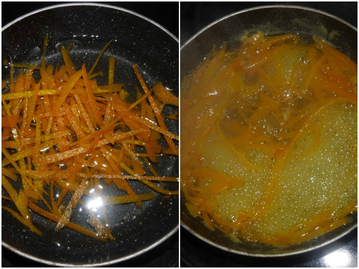 Mettete la buccia in una padella, coprite con un po' di acqua (la buccia deve risutare appena coperta), portate a bollore e poi scolate.