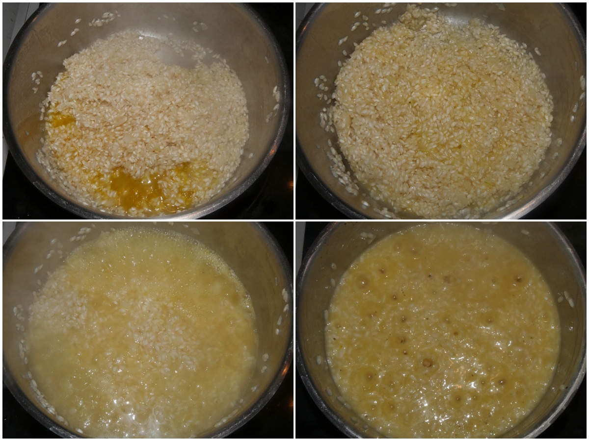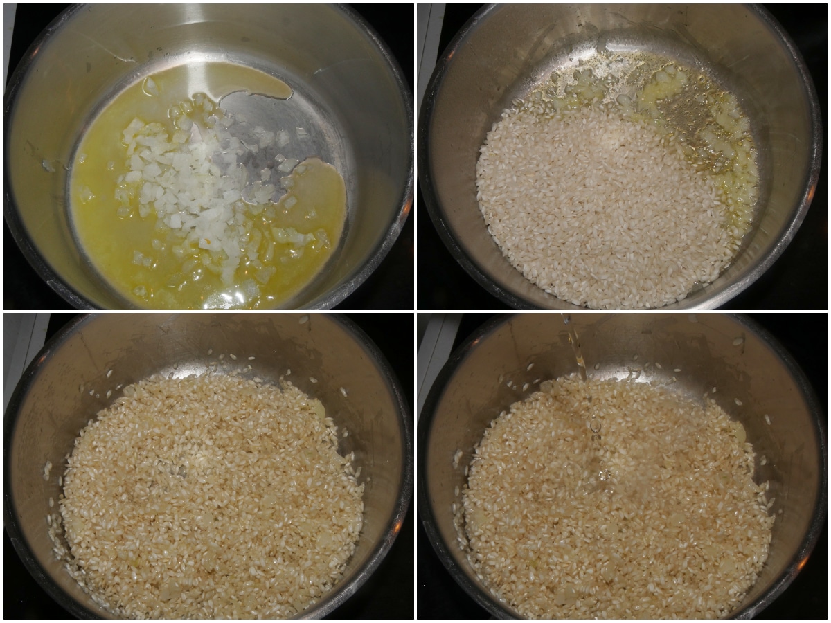 Fate appassire la cipolla con metà del burro fuso, poi unite il riso e fatelo tostare, quindi sfumate col vino.
