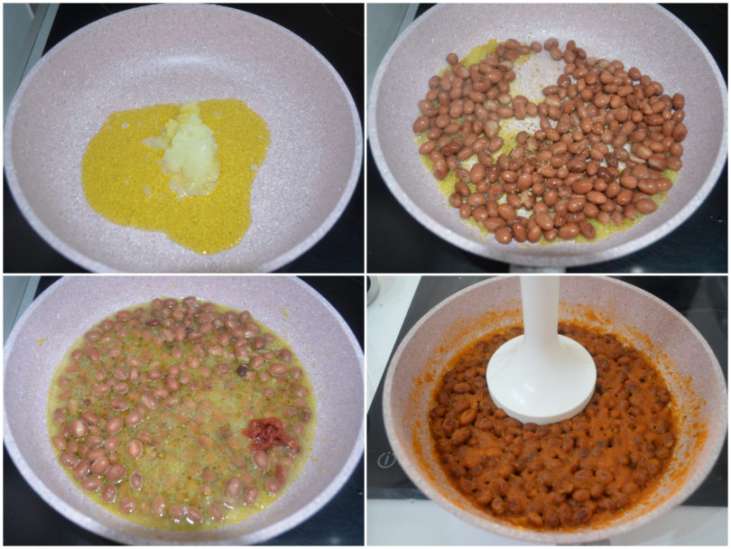 Soffriggete metà della cipolla tritata, quindi aggiungete i fagioli, il concentrato di pomodoro e il brodo e cuocete per almeno 10 minuti, in modo da far insaporire i fagioli ed evaporare il brodo, quindi frullate fino ad ottenere una crema densa ma liscia e omogenea.