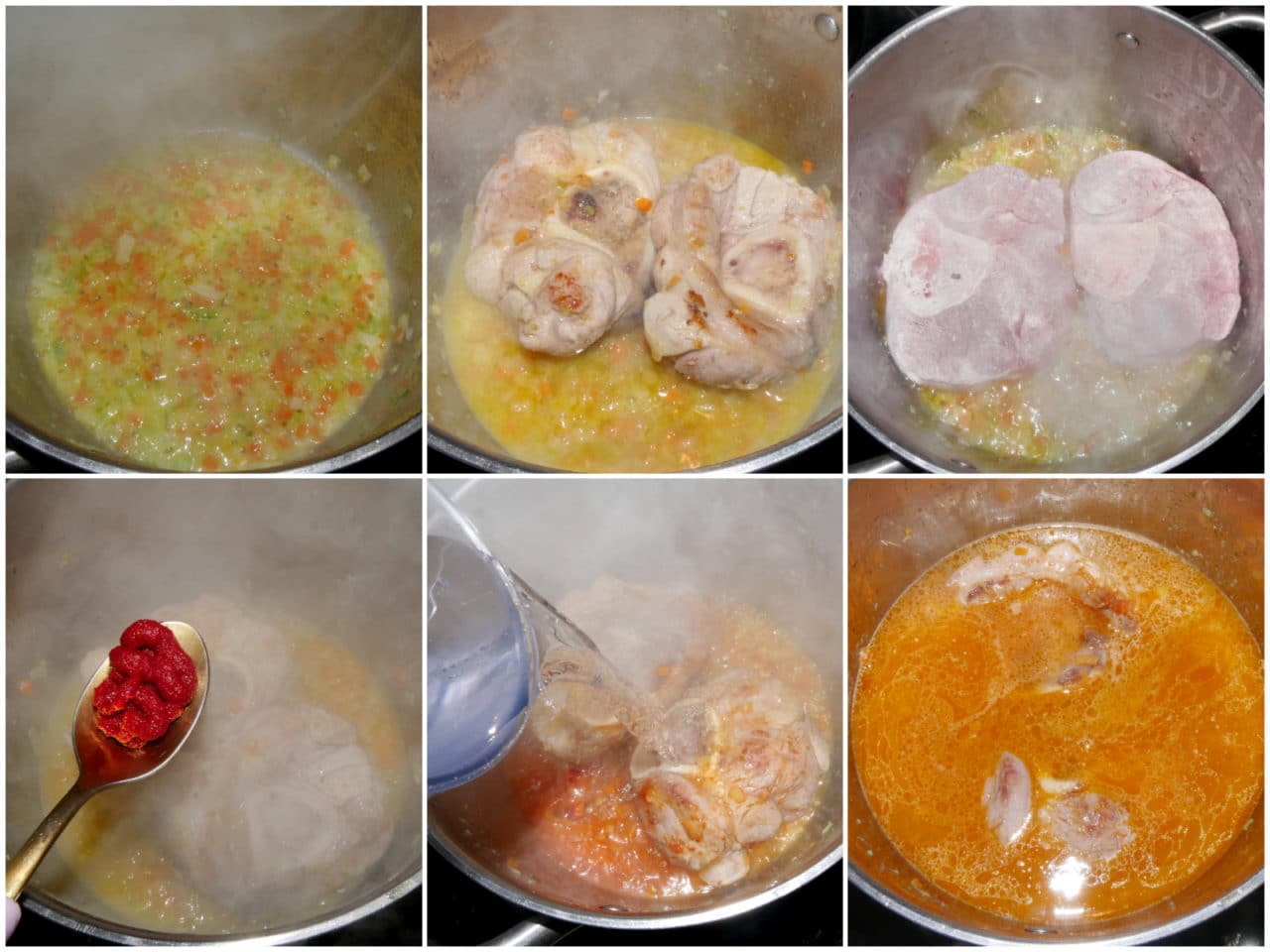 Unite gli ossibuchi, fateli dorare da entrambe le parti, poi sfumate con metà del vino, aggiungete il concentrato e infine unite l'acqua e fate cuocere con coperchio su fiamma bassa per circa 4 ore.
