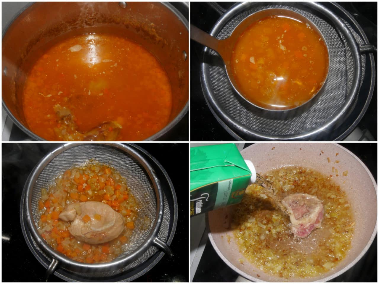 Scolate il brodo, aggiungete gli ossibuchi alla cipolla, sfumate con il vino restante.