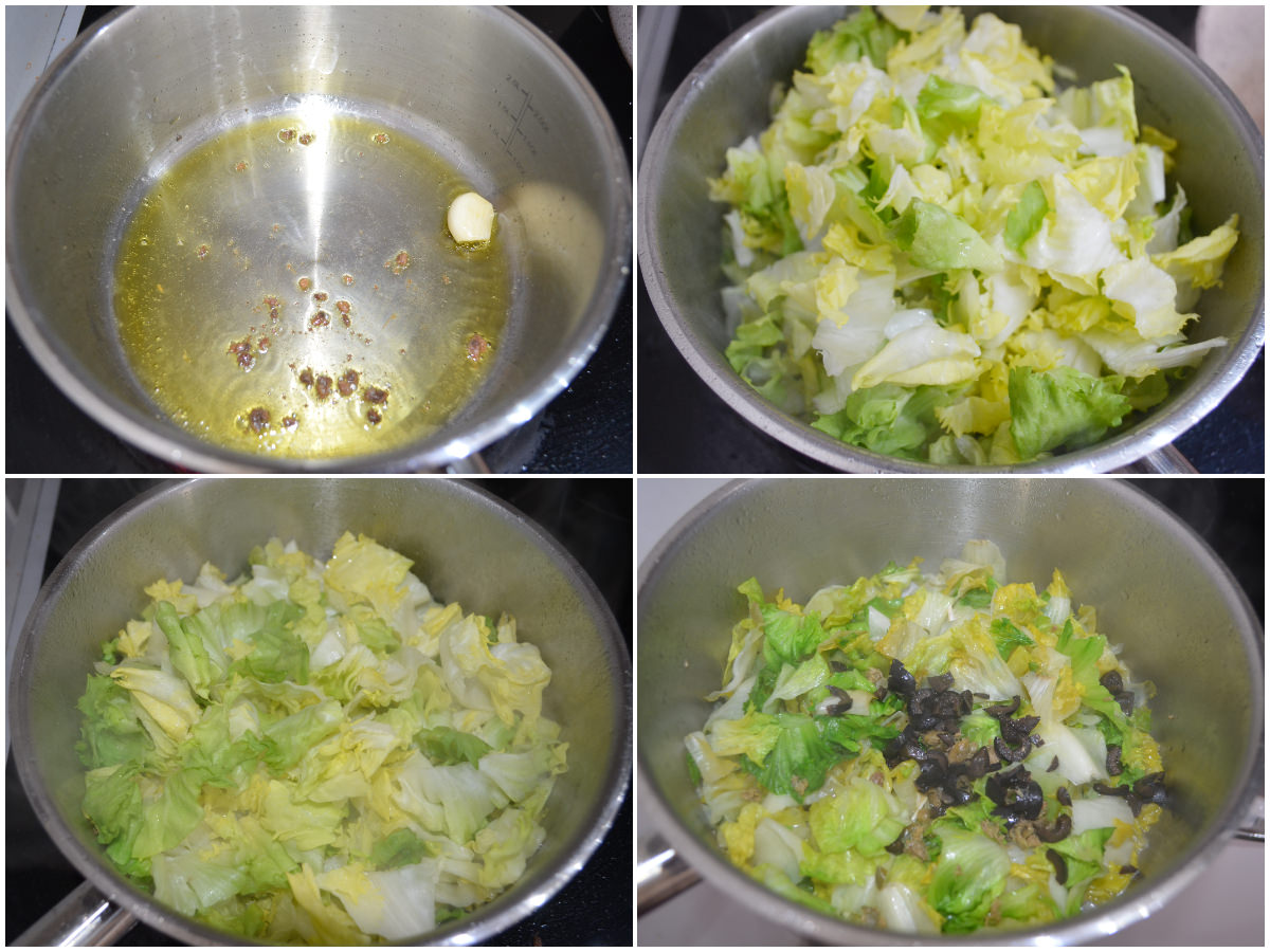 Quando le acciughe si saranno più o meno sciolte, aggiungete le scarole, coprite con coperchio e fate stufare per 15 minuti, in modo che appassiscano.