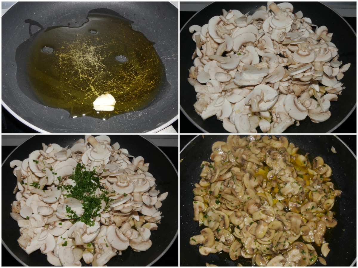 Fate scaldare olio abbondante in una padella antiaderente, fate dorare l'aglio, quindi unite funghi, prezzemolo tritato, sale e pepe e lasciate cuocere per circa 5-10 minuti, mescolando ogni tanto, infine eliminate l'aglio.
