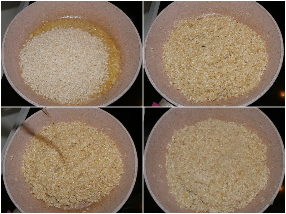 Aggiungete il riso e lasciatelo tostare nel condimento, poi sfumate con il vino bianco.