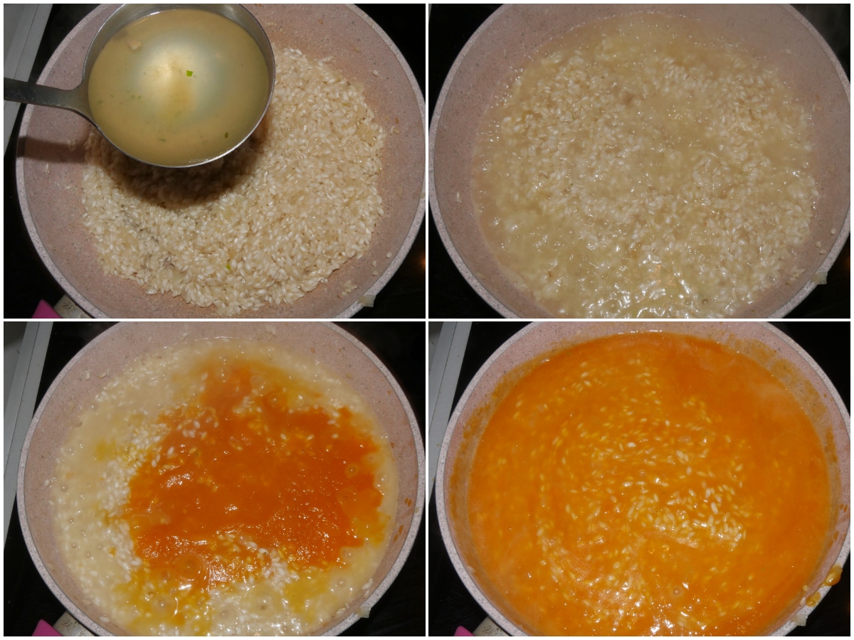 Iniziate la cottura aggiungendo l'acqua di cottura della zucca poco per volta, unendo la purea di zucca a metà cottura.