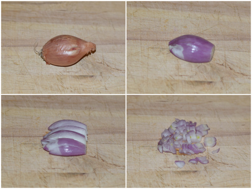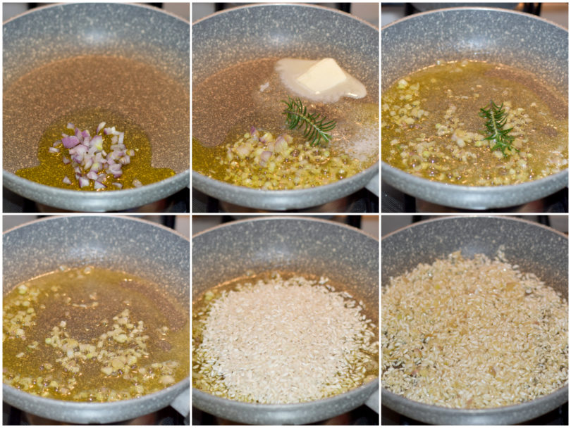 Fate appassire lo scalogno in una casseruola antiaderente con un filo d'olio, metà del butto e il rosmarino.