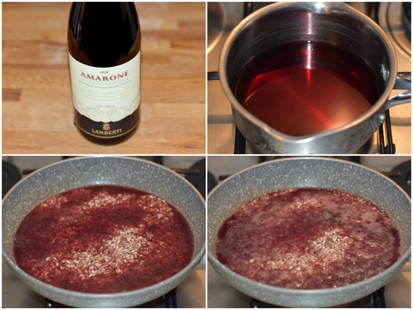 Nel frattempo scaldate il vino in un pentolino, quindi aggiungetelo al riso.