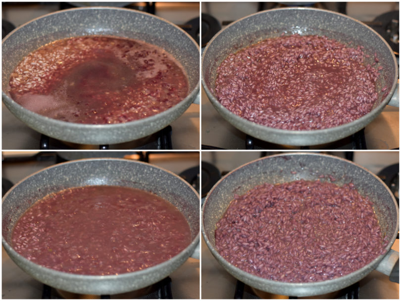 Man mano che il vino evapora e viene assorbito iniziate ad aggiungere il brodo caldo per continuare la cottura. poco per volta.