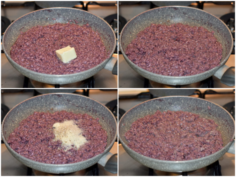 Quando il riso risulterà cotto mantecatelo con il burro restante e completate con formaggio e aggiustando di sale e pepe.
