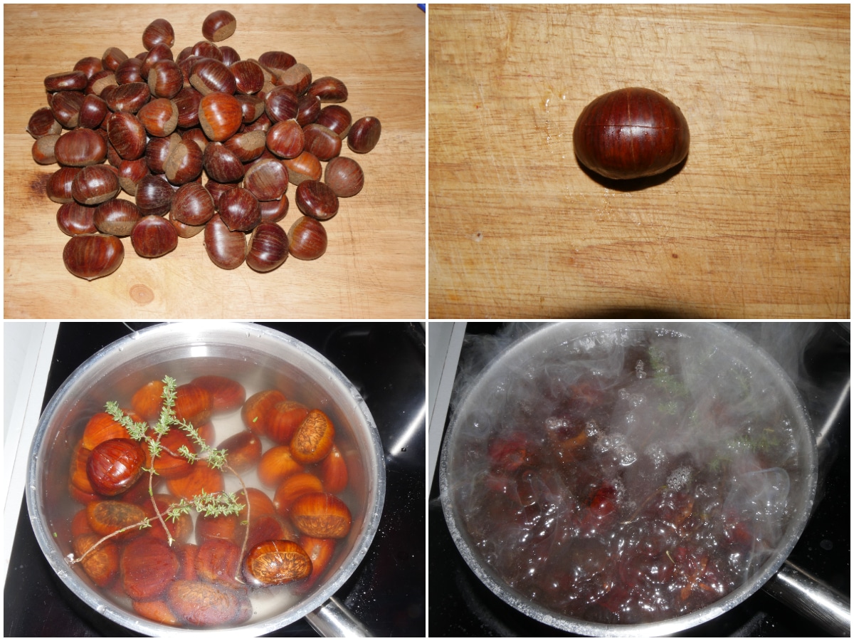Pulite le castagne, incidete una croce sulla parte bombata e mettetele in una pentola con del timo e un pizzico di sale, coprendo con abbondante acqua: portate a bollore e cuocete per 40 minuti circa.