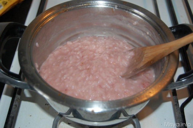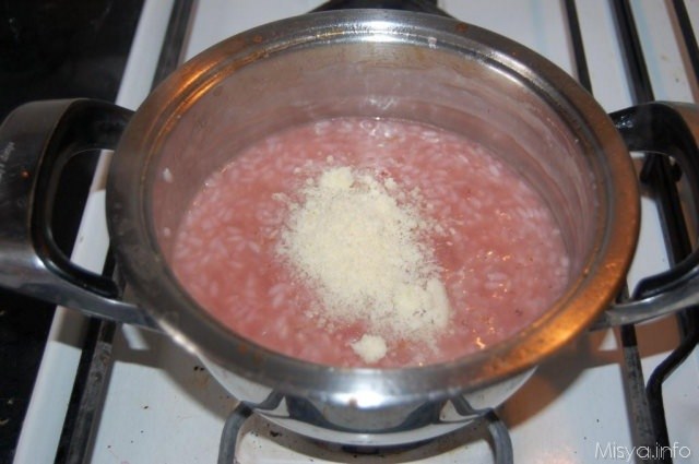 Spegnere la fiamma, aggiungere il parmigiano e mantecate il risotto alle fragole con un cucchiaio di legno.