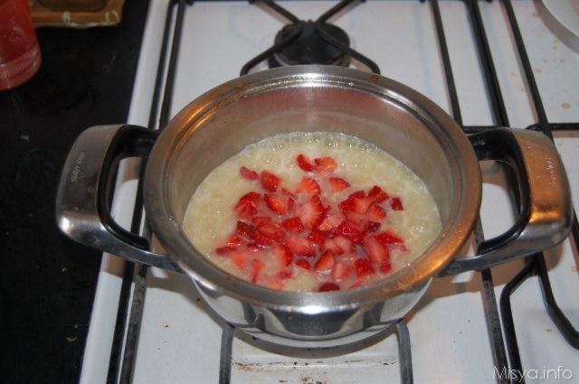 Lavare le fragole, eliminare il picciolo e tagliatele a pezzetti. Aggiungetele a metà cottura.