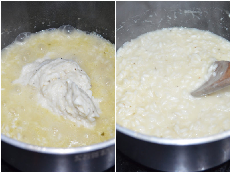 Verso fine cottura, aggiungete il composto di pecorino al riso per mantecarlo e aggiustate di sale se necessario.