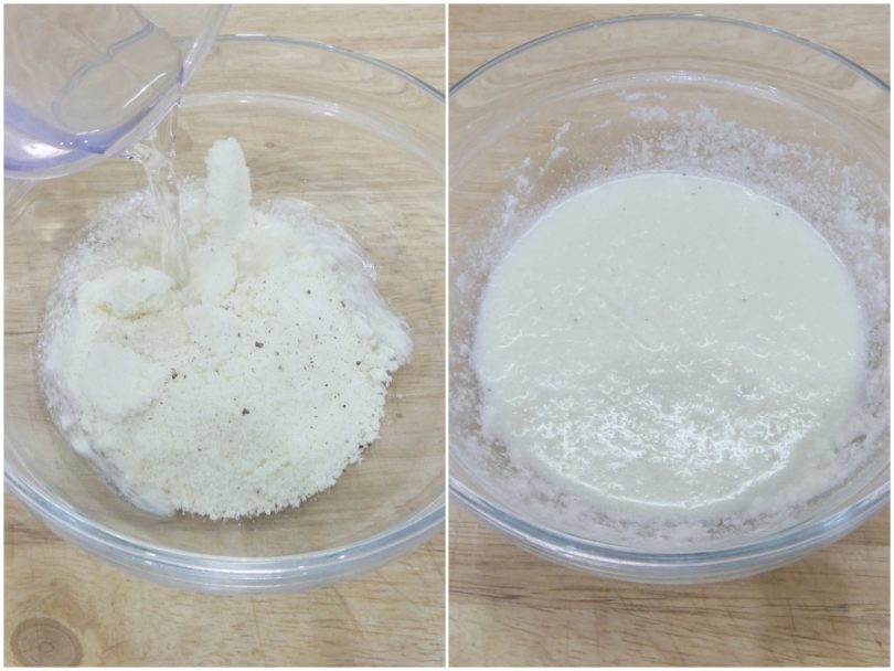 Innanzitutto preparate la crema di pecorino mescolando tra loro il formaggio grattugiato con pepe e abbastanza acqua fredda da creare una cremina densa.