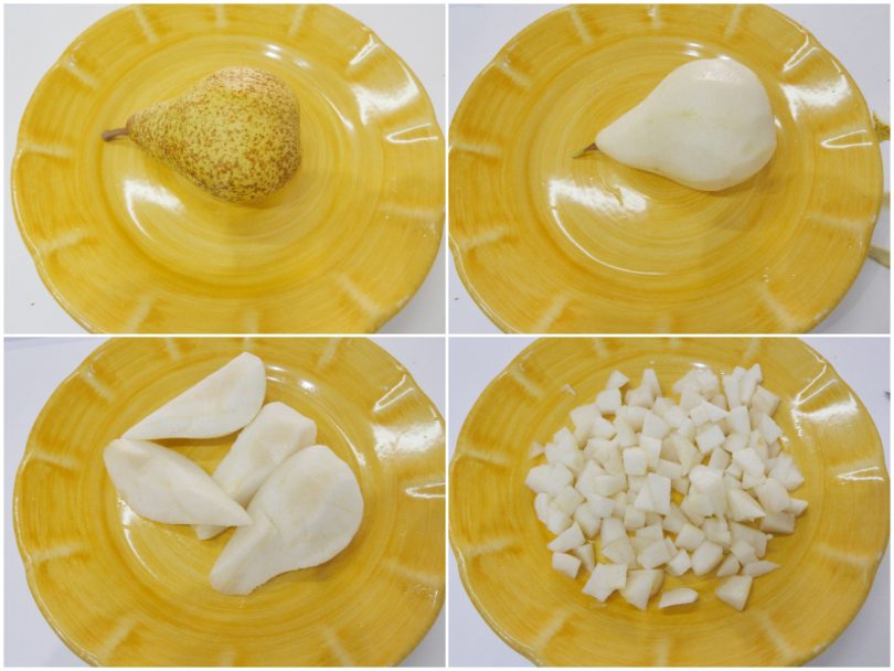 Aggiungete le pere a dadini e fate insaporire tutto insieme per qualche minuto, quindi sfumate con il vino.