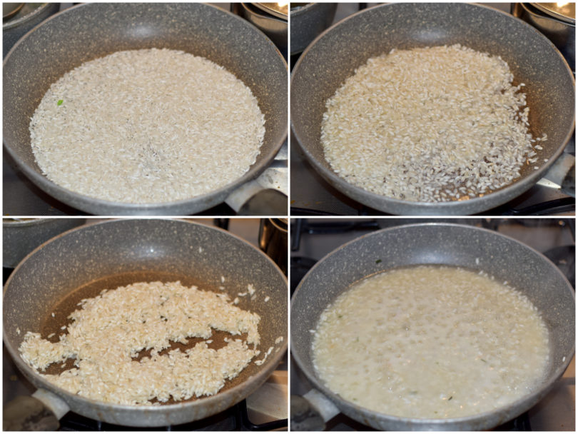 Fate tostare il riso in una casseruola antiaderente, senza condimento, mescolando continuamente, poi sfumate con il vino e solo dopo che questo sarà evaporato iniziate la cottura aggiungendo il brodo poco per volta.