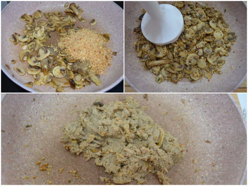 Aggiungete la metà delle nocciole tritate ai funghi, fate insaporire brevemente, tenetene da parte un pochino per la decorazione e frullate il resto fino ad ottenere una crema densa.