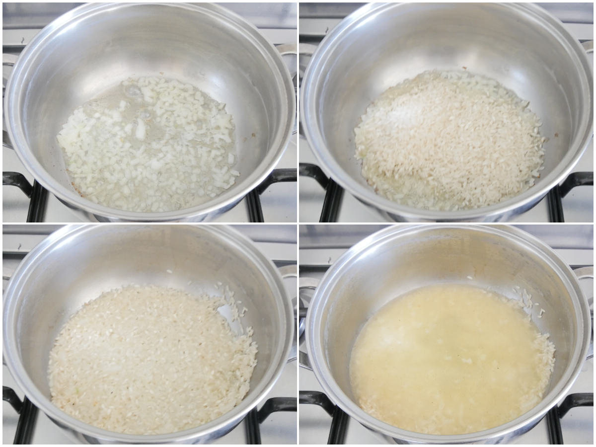 Nel frattempo, fate appassire la cipolla tritata in una pentola con un po' di burro, quindi unite anche il riso e fatelo tostare, poi sfumate con il vino.