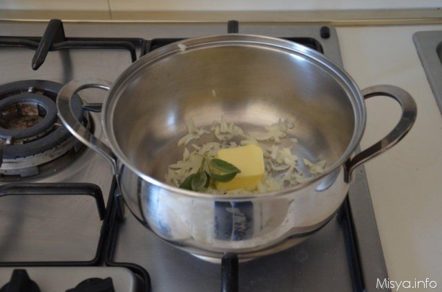 Tritate la cipolla finemente e fatela rosolare insieme alla salvia in una casseruola con il burro.